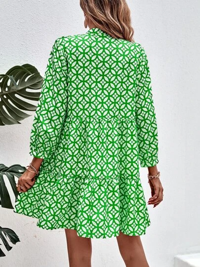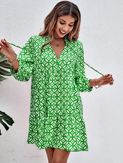 SHEIN VCAY Floral Print Tie Neck Smock Dress