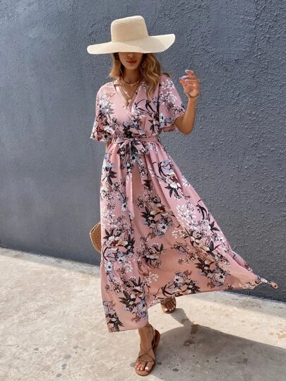 SHEIN VCAY Surplice Front Floral Print Belted Dress