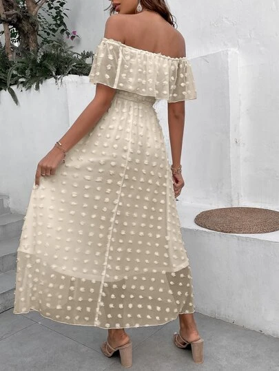 SHEIN VCAY Swiss Dot Off Shoulder Ruffle Trim Split Thigh Dress