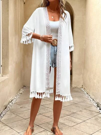 SHEIN VCAY Tassel Trim Open Front Kimono Without Cami Top