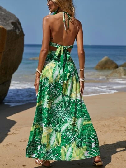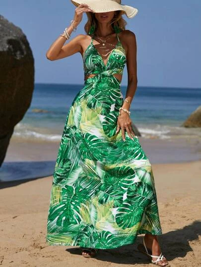 SHEIN VCAY Tropical Print Cut Out Waist Tie Backless Halter Neck Dress