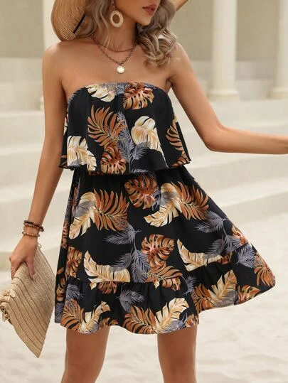 SHEIN VCAY Tropical Print Ruffle Hem Tube Dress