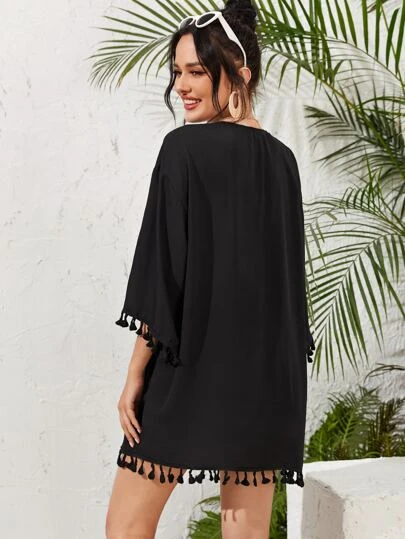 SHEIN WYWH Open Front Drop Shoulder Tassel Hem Kimono