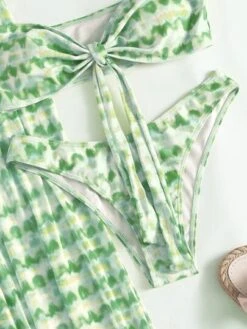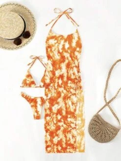 Tie Dye Bikini Set Halter Triangle Bra & Bikini Bottom & Cover Up Skirt 3 Piece Bathing Suit