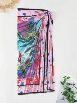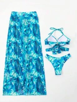 Tropical Print Halter Triangle Bikini Swimsuit With Cover Up