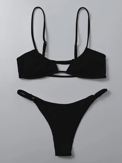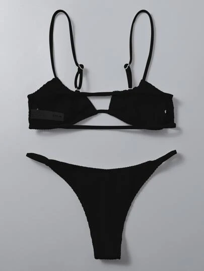 Textured Bikini Set Cutout Front Cami Top & High Cut Thong 2 Piece Swimsuit