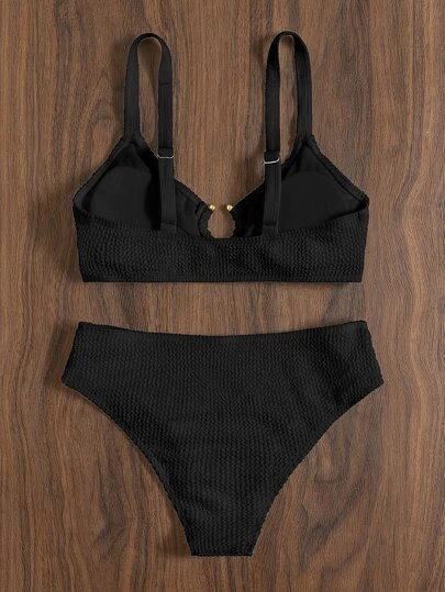 Textured Bikini Set Ring Linked Cut Out Bra Top & High Waisted Bikini Bottom 2 Piece Swimsuit