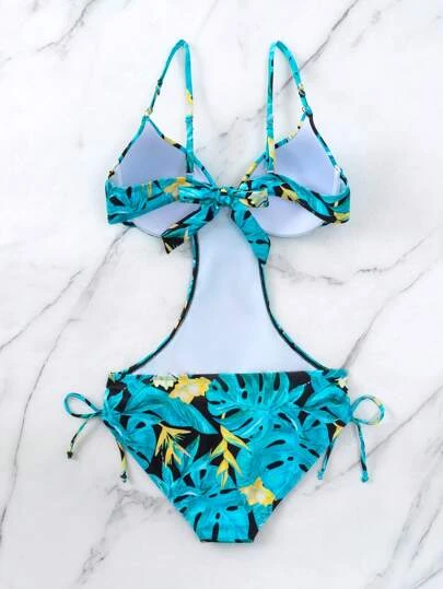 Tropical Print Cut Out Tie Side One Piece Swimsuit