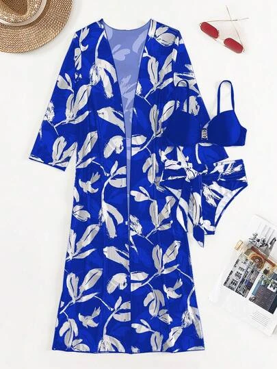 Tropical Print Push Up Bikini Swimsuit With Kimono