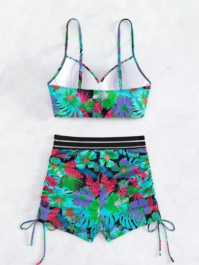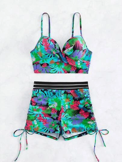 Tropical Print Push Up Shorts Bikini Swimsuit