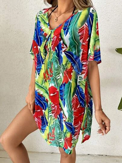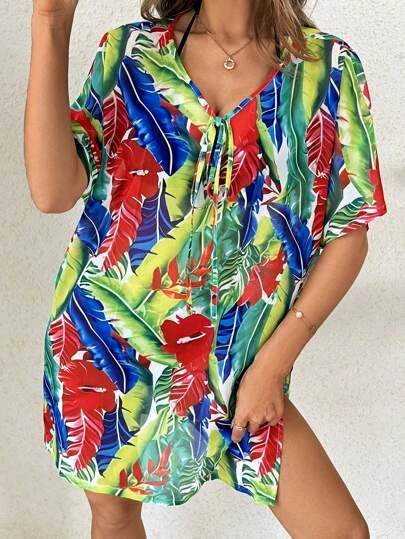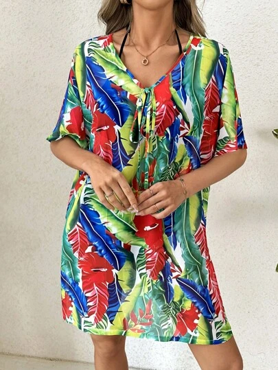Tropical Print V Neck Batwing Sleeve Knot Front Cover Up Dress
