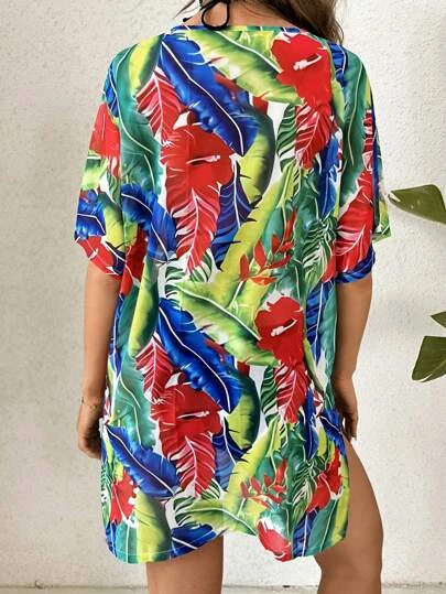 Be the first to review “Tropical Print V Neck Batwing Sleeve Knot Front Cover Up Dress” Cancel reply