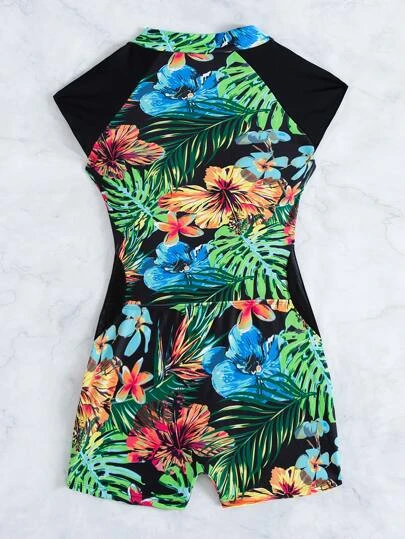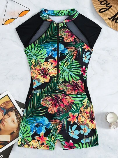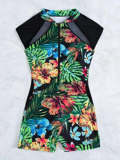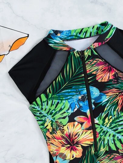 Tropical Print Zipper One Piece Swimsuit