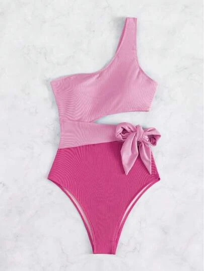Two Tone Cut Out Knot Side One Shoulder One Piece Swimsuit