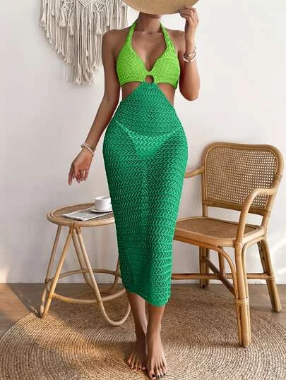Two Tone Ring Linked Cut Out Tie Backless Cover Up Dress Without Panty