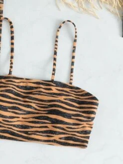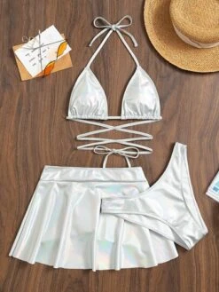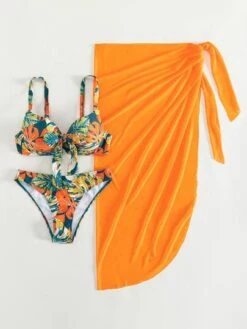 3pcs Tropical Print Push Up Bikini Swimsuit With Beach Skirt