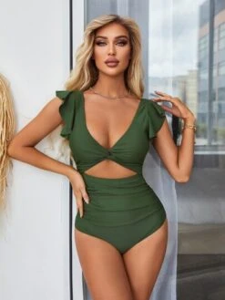 Twist Cut Out Ruched Side Butterfly Sleeve One Piece Swimsuit