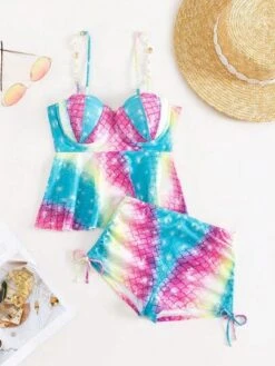 Eyelet Embroidery Scallop Trim Push Up Shorts Bikini Swimsuit