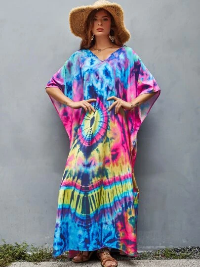 Women’s Long V-neck Half Sleeve Cover Up Kaftan Maxi Dress, Printed, Summer Beach Vacation Wear