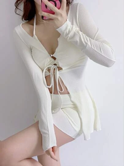 Women’s Swimsuit 2023 New Split Anti-Uv Long-Sleeved Cover-Up, Sexy Pure Color, Halter Bikini, Beach Wear, White
