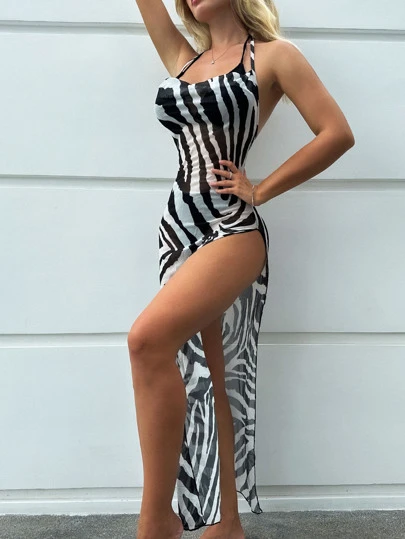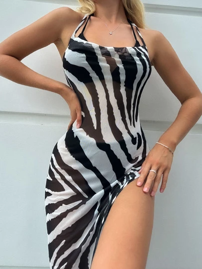Zebra Striped Split Thigh Halter Neck Backless Mesh Cover Up Dress